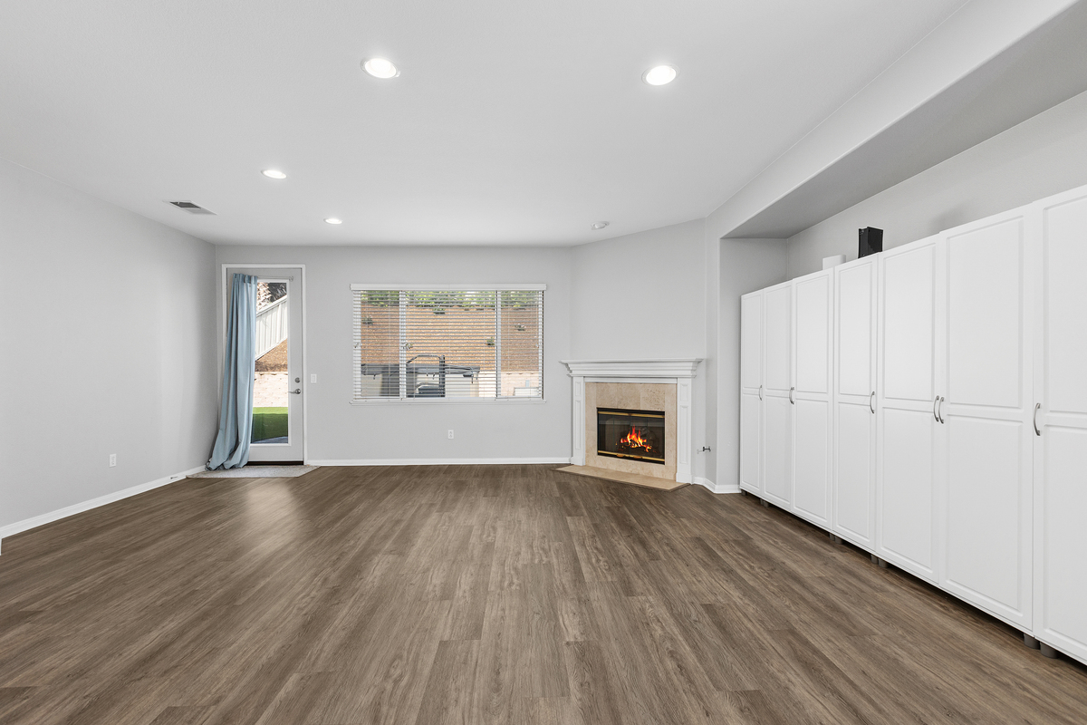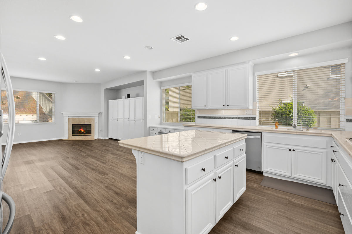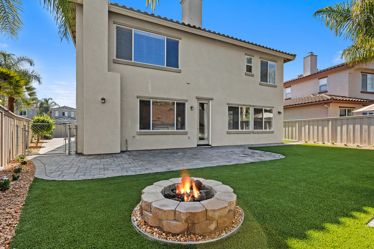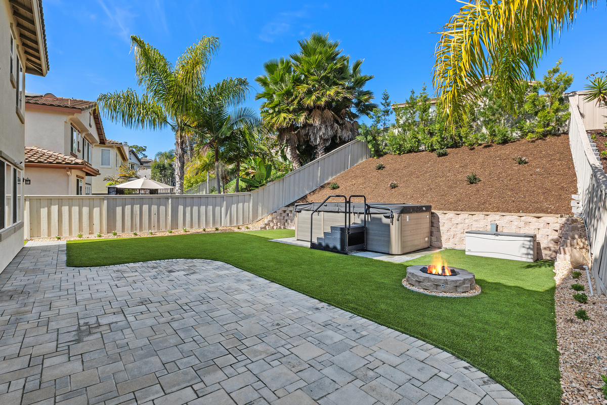 Welcome to this exceptional 5-bedroom, 3-bath Calavera Hills home with owned solar, a main-level bedroom, full bath, and a large yard with a swim spa. A soaring two-story foyer welcomes you and flows into the formal spaces. The two-story dining room showcases a wall of windows that fill the space with natural light and seamlessly lead into the adjacent formal living room. Luxury vinyl plank floors extend throughout this level, leading to the heart of the home: an expansive kitchen with classic white cabinetry, a center island with breakfast bar, double ovens, and a daily dining area. The family room centers on a fireplace with a media niche and a wall of windows to the yard. Completing this level are a bedroom with French doors, a full bath with a walk-in shower, and a laundry room with a utility sink and upper cabinets. An elegant, curved staircase leads to the generous primary suite with a fireplace, two walk-in closets, and a private retreat that closes with French doors. The primary bath includes a large walk-in shower with a bench, an oversized soaking tub, two vanities plus a seated vanity, and a separate water closet. Three additional bedrooms, a hall bath, and an expansive walk-in linen closet complete the upper level. Outdoors, enjoy turf, a paver patio, a gas fire pit, a large swim spa, and two oversized side yards, one turf and one concrete. Additional features include dual-zoned AC and furnace (new in 2021), Ecobee thermostats, ceiling fans, and a Ring camera system. Conveniently located near Lake Calavera Preserve with access to Calavera trails, parks, shopping, and a short drive to the beach.