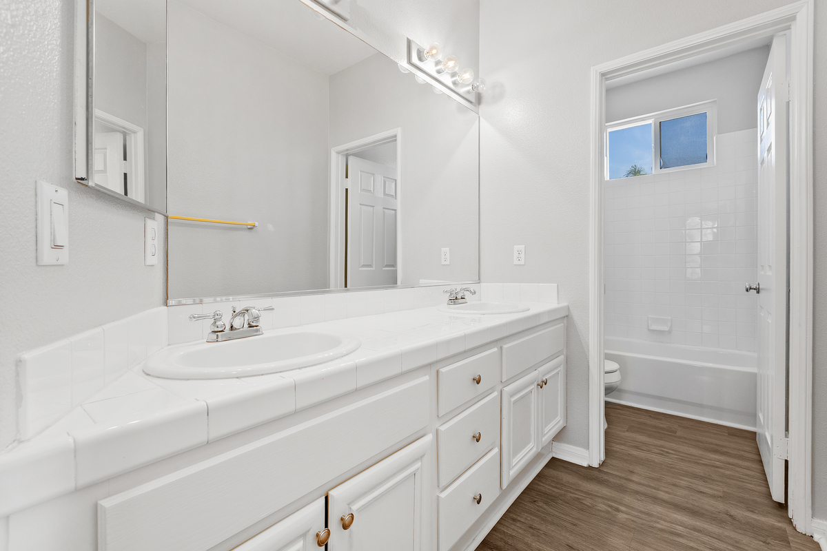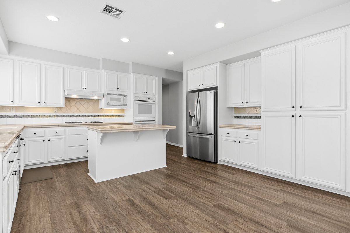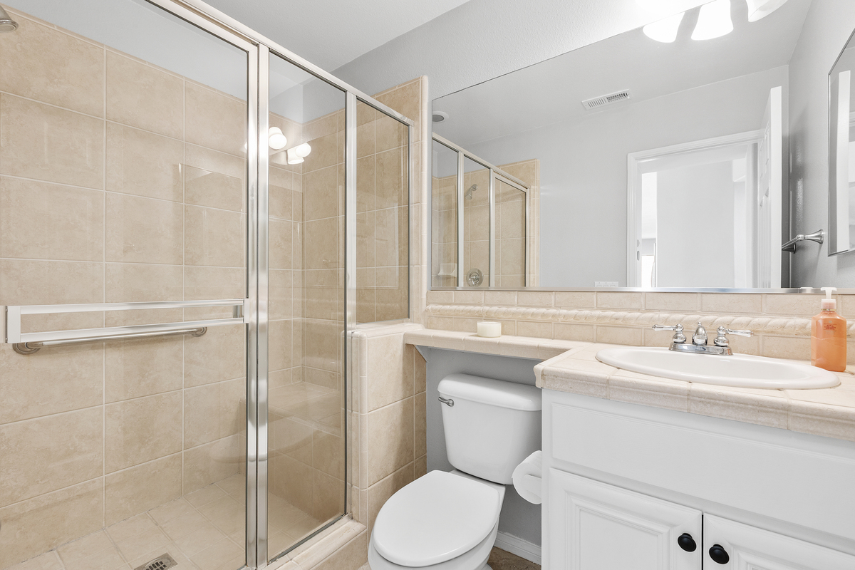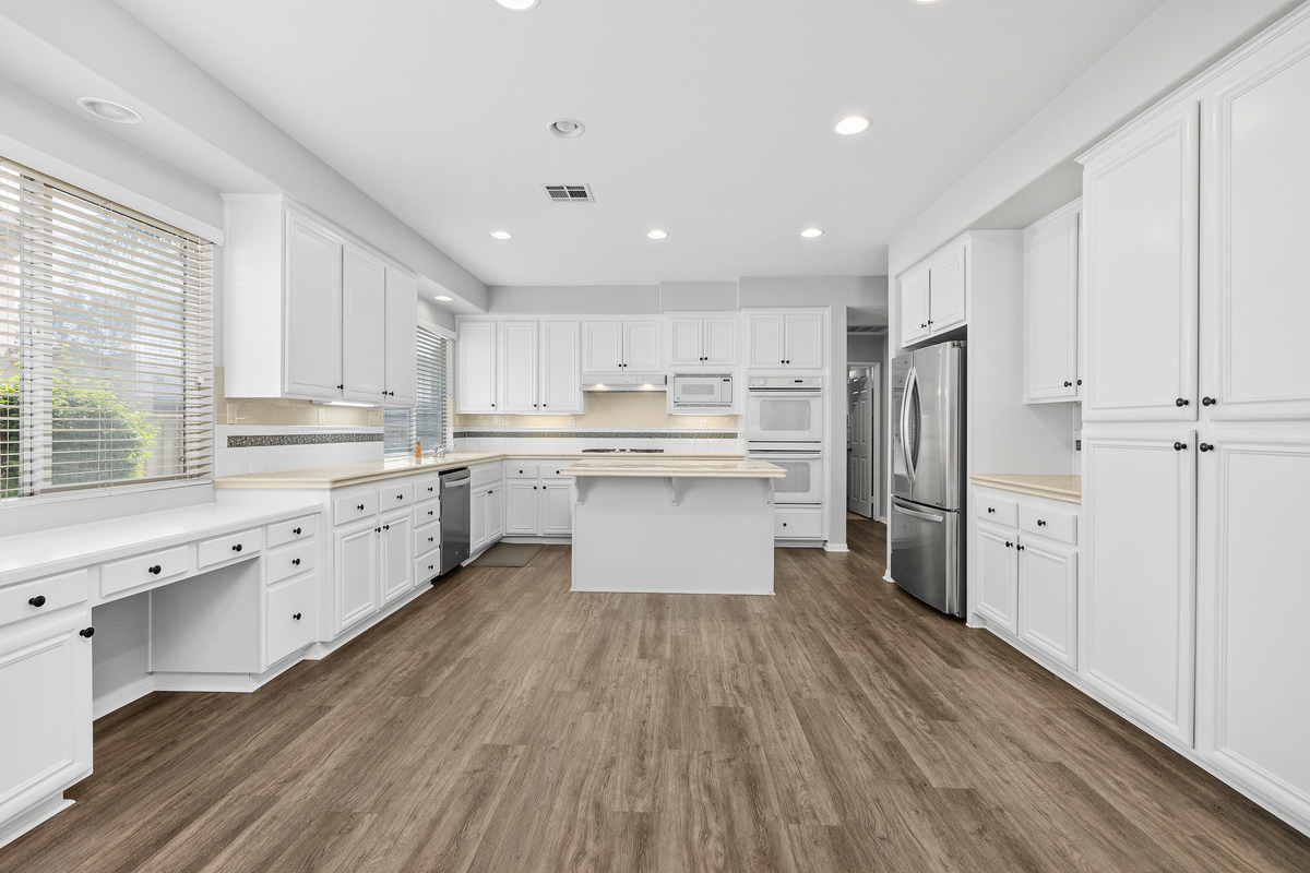 Welcome to this exceptional 5-bedroom, 3-bath Calavera Hills home with owned solar, a main-level bedroom, full bath, and a large yard with a swim spa. A soaring two-story foyer welcomes you and flows into the formal spaces. The two-story dining room showcases a wall of windows that fill the space with natural light and seamlessly lead into the adjacent formal living room. Luxury vinyl plank floors extend throughout this level, leading to the heart of the home: an expansive kitchen with classic white cabinetry, a center island with breakfast bar, double ovens, and a daily dining area. The family room centers on a fireplace with a media niche and a wall of windows to the yard. Completing this level are a bedroom with French doors, a full bath with a walk-in shower, and a laundry room with a utility sink and upper cabinets. An elegant, curved staircase leads to the generous primary suite with a fireplace, two walk-in closets, and a private retreat that closes with French doors. The primary bath includes a large walk-in shower with a bench, an oversized soaking tub, two vanities plus a seated vanity, and a separate water closet. Three additional bedrooms, a hall bath, and an expansive walk-in linen closet complete the upper level. Outdoors, enjoy turf, a paver patio, a gas fire pit, a large swim spa, and two oversized side yards, one turf and one concrete. Additional features include dual-zoned AC and furnace (new in 2021), Ecobee thermostats, ceiling fans, and a Ring camera system. Conveniently located near Lake Calavera Preserve with access to Calavera trails, parks, shopping, and a short drive to the beach.